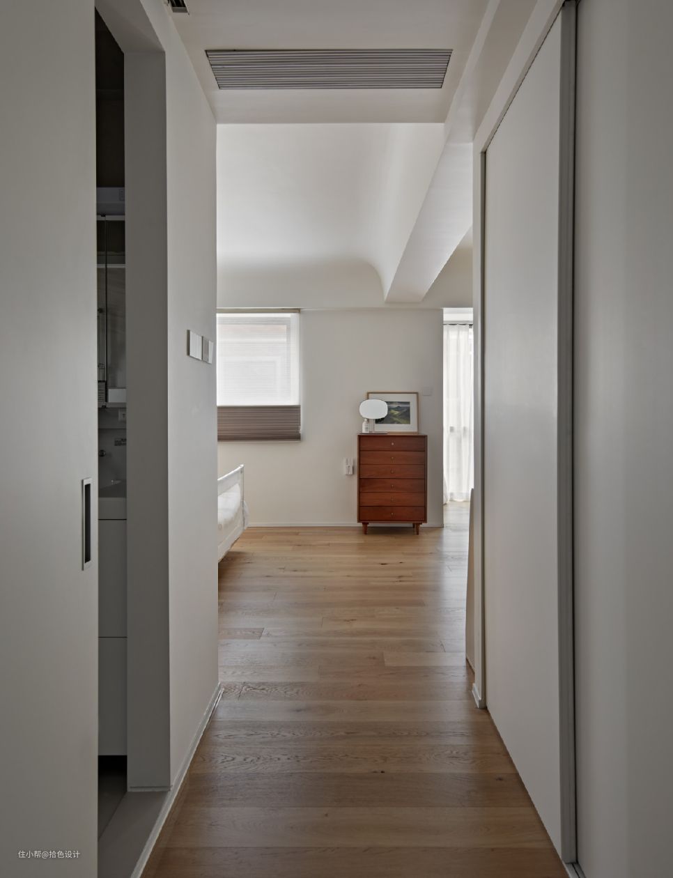 主卧看向客厅视角,右边卫生间选择平板幽灵门,再次呼应了极简主题。同时,旁边还增加了一组嵌入式储物柜,再次补充了收纳。
