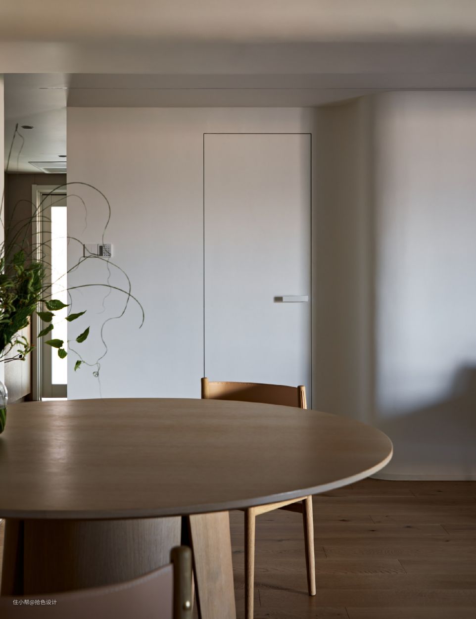 为了强调空间的整体感,旁边的主卧选择了无框隐形门,并在饰面色彩上,尽可能与墙面保持了统一,使其看起来更加秩序美观。