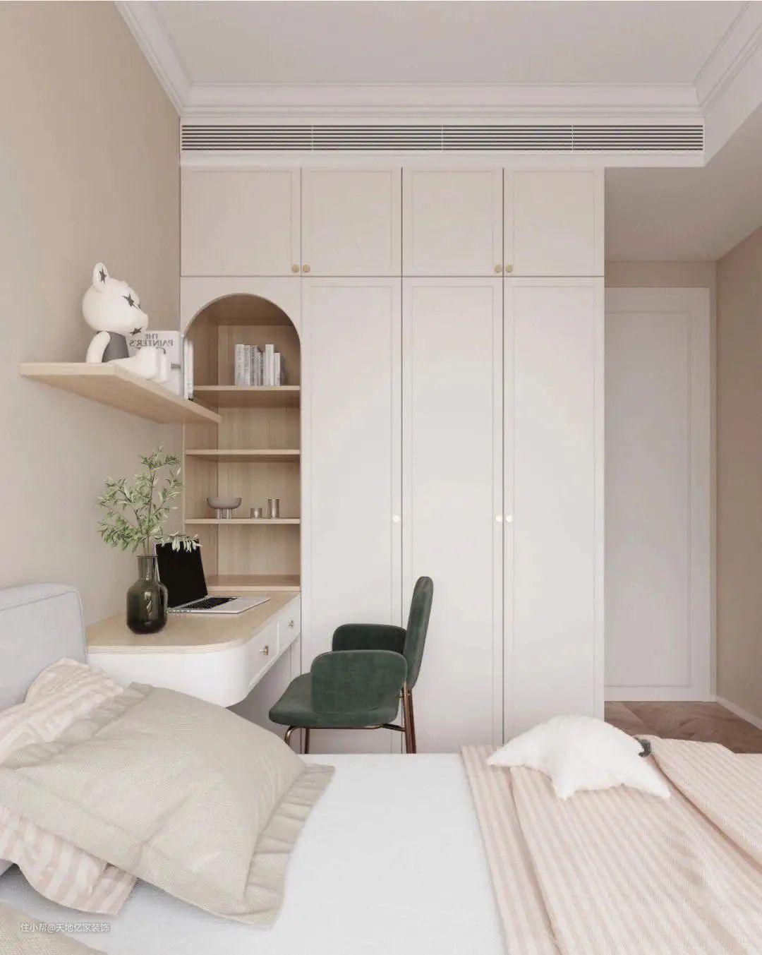 卧室主体主要由衣柜、床、书桌组成,尺寸上根据空间安排即可,一般建议床侧与墙保持50cm的距离,衣柜与床的距离不小于90cm,给柜门留出足够空间