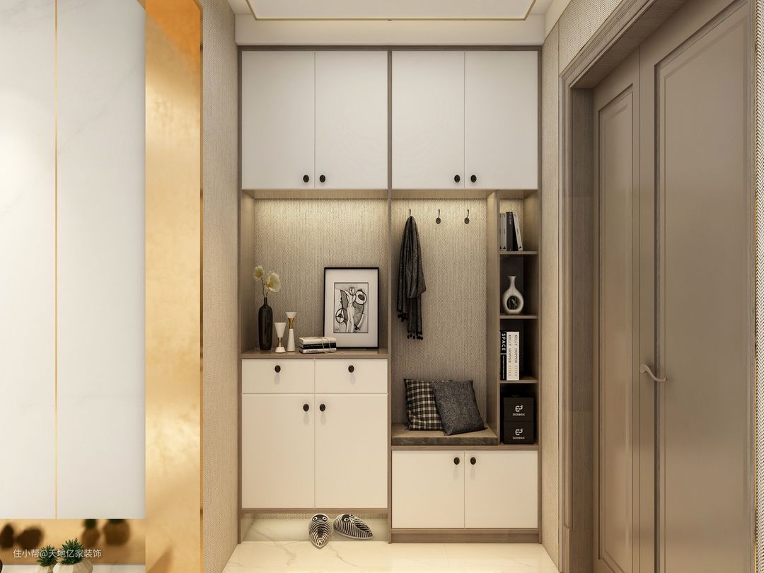 鞋柜最好有两段留空,在底部留空20cm,用来收纳拖鞋和常穿的鞋子。中部要留高度40cm的空间,放随身物品比如钥匙和包。