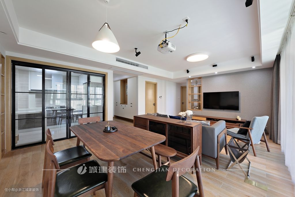 当然我们也能看到通过利用餐边柜的方式来划分这两个区域,沙发背靠餐边柜,一定程度满足收纳需求。