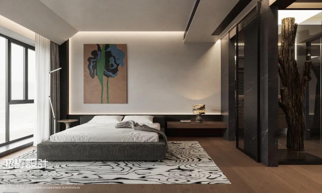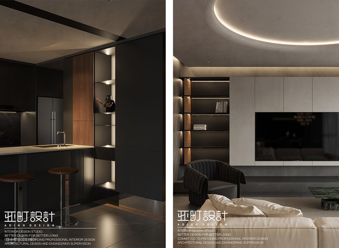 全屋中性灰为主色调,搭配柔和的暖光灯光驱赶深色的沉闷,空间多了一份层次感,显得更加深邃宁静。