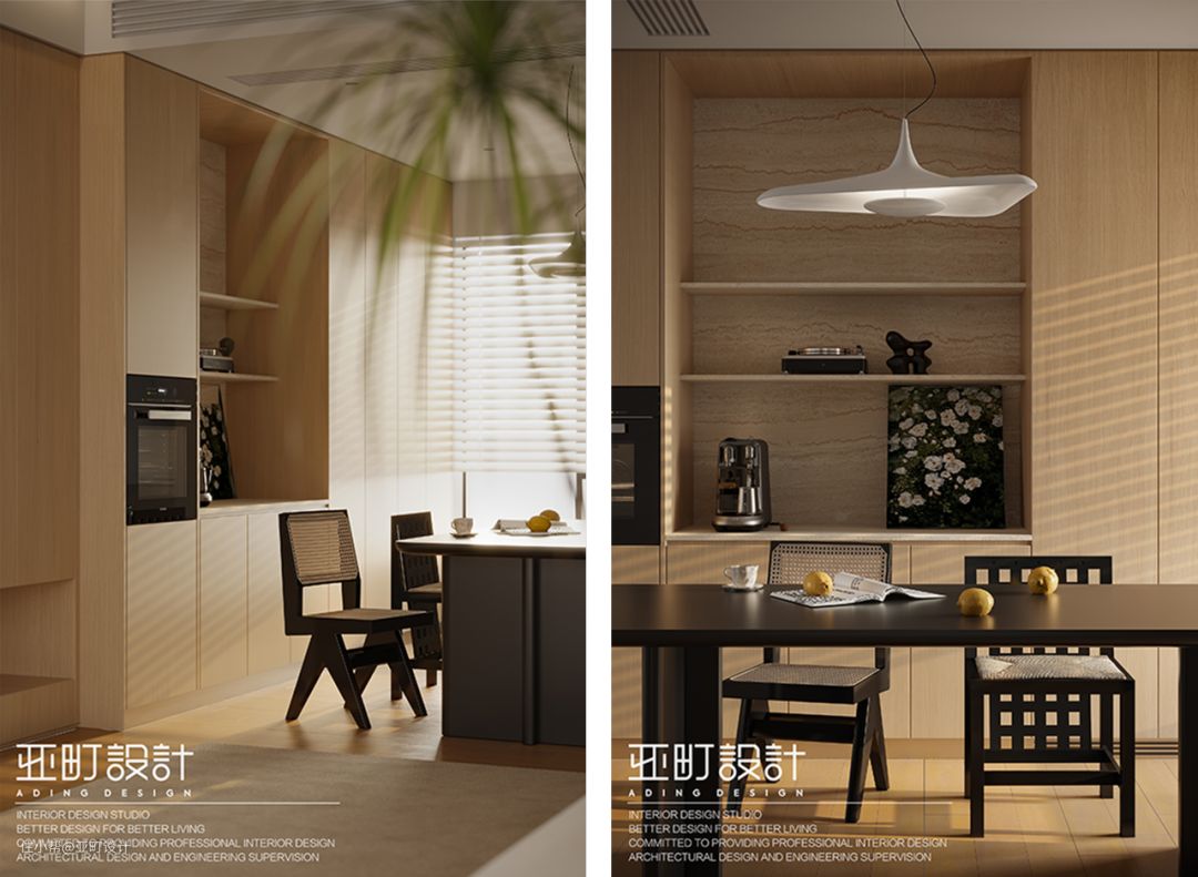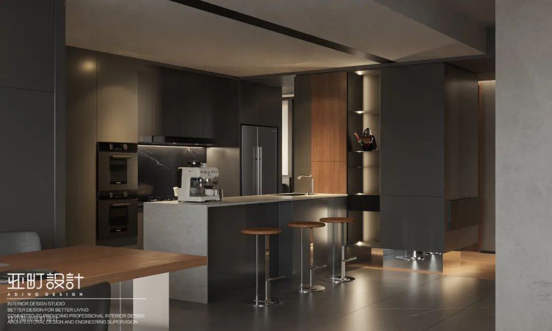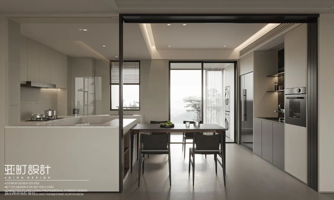 厨房将客厅与餐厅整合,空间通透流畅,让户外自然光线自然洒入室内。极简的黑灰白空间依循时间变化,呈现浓淡皆宜的节奏感。