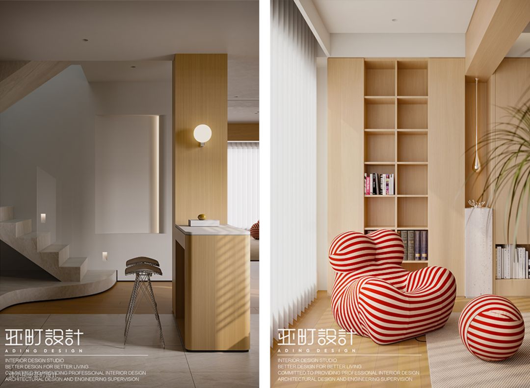 整个书房柜子采用现代简约设计,奶白色收纳柜与深木色的加长书桌与书柜一体搭配,营造明亮惬意的氛围。窗边地板抬高,可作为一个休闲娱乐区。