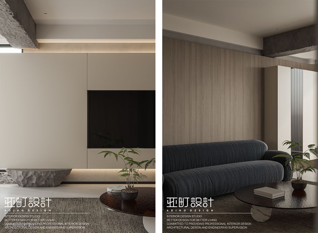 电视背景墙以灰白为主,搭配同色系的米白沙发、灰白地毯,运用软装的柔软质感中和空间线条。