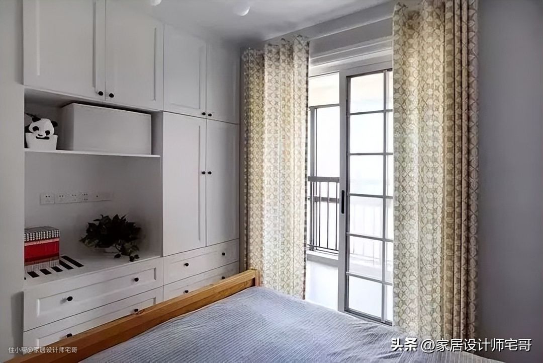 床尾对面,设计师定制了一组嵌入式的收纳柜,简直是收纳迷的天堂!通过封闭和开放格的组合,满足不同物品的收纳需求。