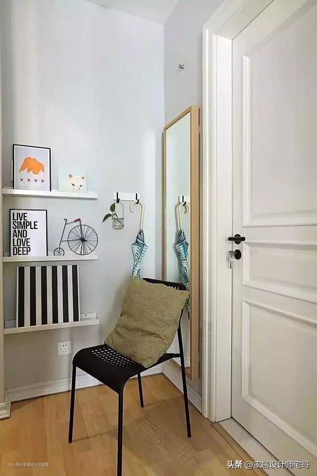 仔细观察玄关内,墙上还挂着一面镜子,不仅增加了空间的明亮感,还方便屋主在出门前整理形象。