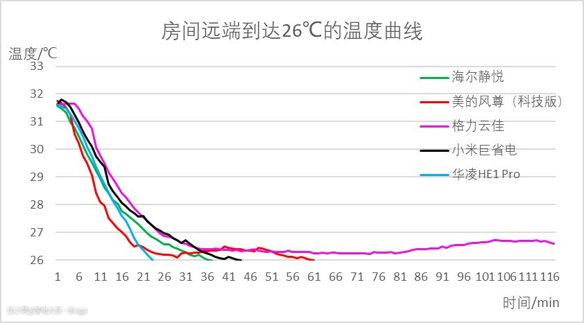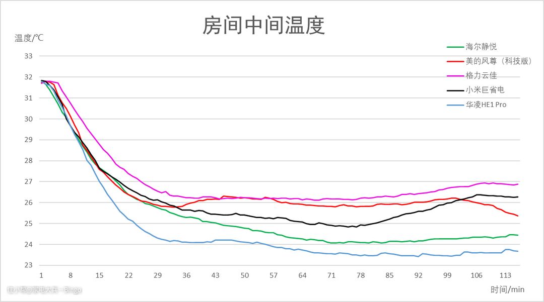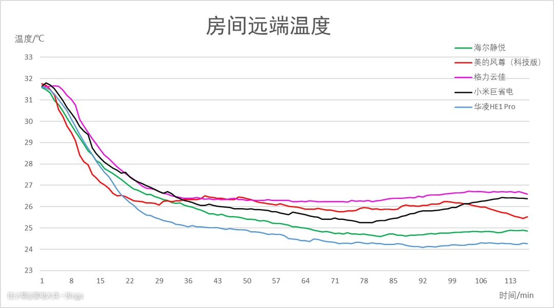 慢着,其实,耗电量还需要和制冷量综合起来看,由于测试条件无法达到专业焓差室的条件,无法准确测出各台空调的实际制冷量,这里我们只能通过房间中间、远端的温度下降曲线,去侧面推断各台空调制冷量的情况。