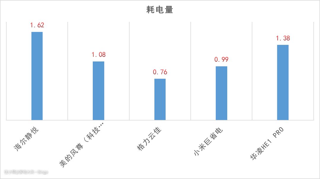 在同样的测试条件下(华凌HE1 Pro多了一侧吸热面),125min各台空调耗电量如下:海尔静悦1.62Kw·h;美的风尊(科技版)1.08Kw·h;格力云佳0.76Kw·h;小米巨省电0.99Kw·h;华凌HE1 Pro 1.38Kw·h。