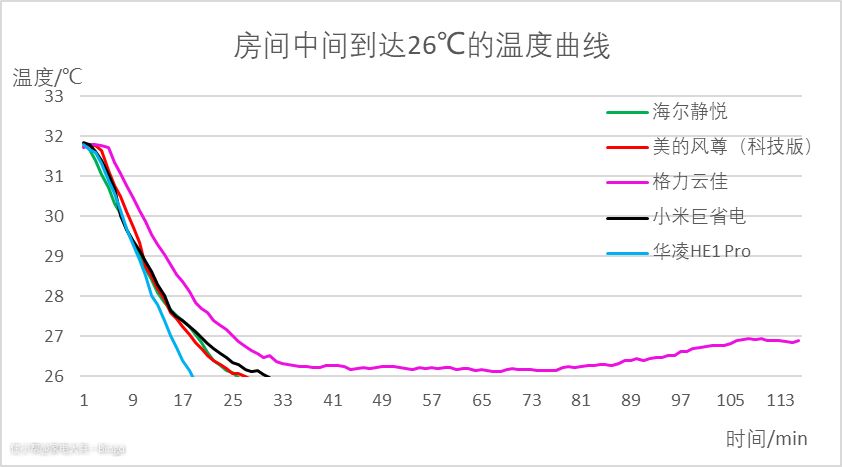 耗电量处在第二梯队的小米巨省电和美的风尊(科技版),前期降温速度几乎相同,中间很长一段时间,小米巨省电室内温度下降并控制在25°C左右,风尊曲线更贴近26°C的目标温度;后期巨省电室温上升,风尊室温下降,黑色曲线和红色曲线出现了明显交叉;但是从整体上分析,小米巨省电在耗电量稍低的情况下,制冷量更大一些,在24-26°C附近工作时,这台机子能够发挥出自己最好的性能。