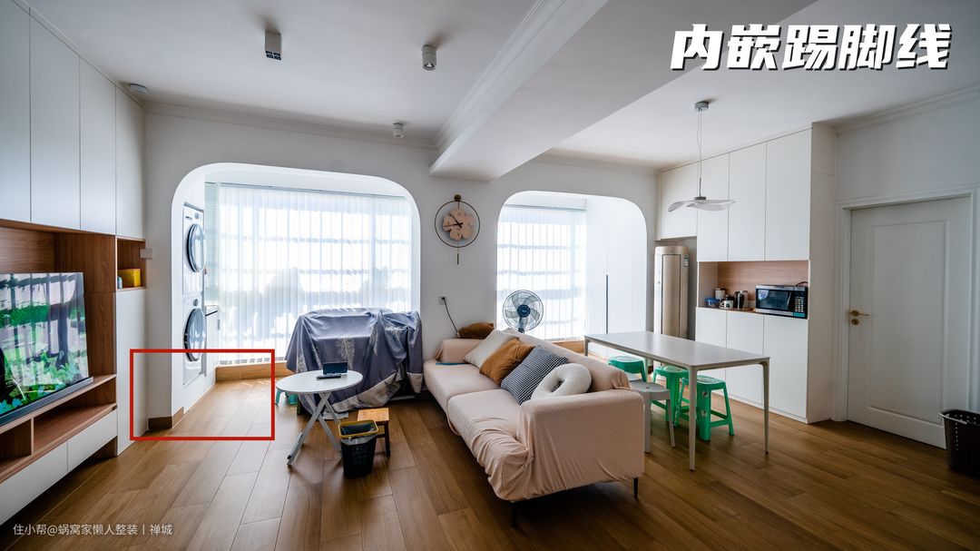 可以在踢脚线上做文章,最简单的就是墙面深度开槽2-3公分左右,高度5-12公分均可,做往内铺贴瓷砖做嵌入式踢脚线,左右的踢脚线表面与墙面平齐,不积灰、不怕潮、不怕水,家具能靠墙,省空间,易清理。