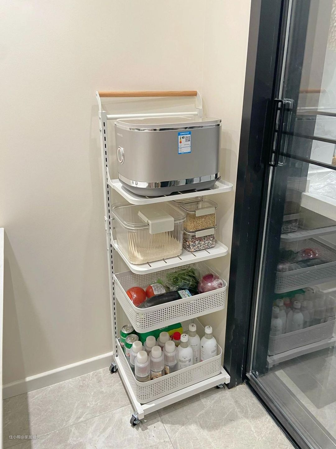 移动式储物车: 在厨房内放置一个移动式储物车,可以根据需要随时移动,方便存放调味品、食材等。