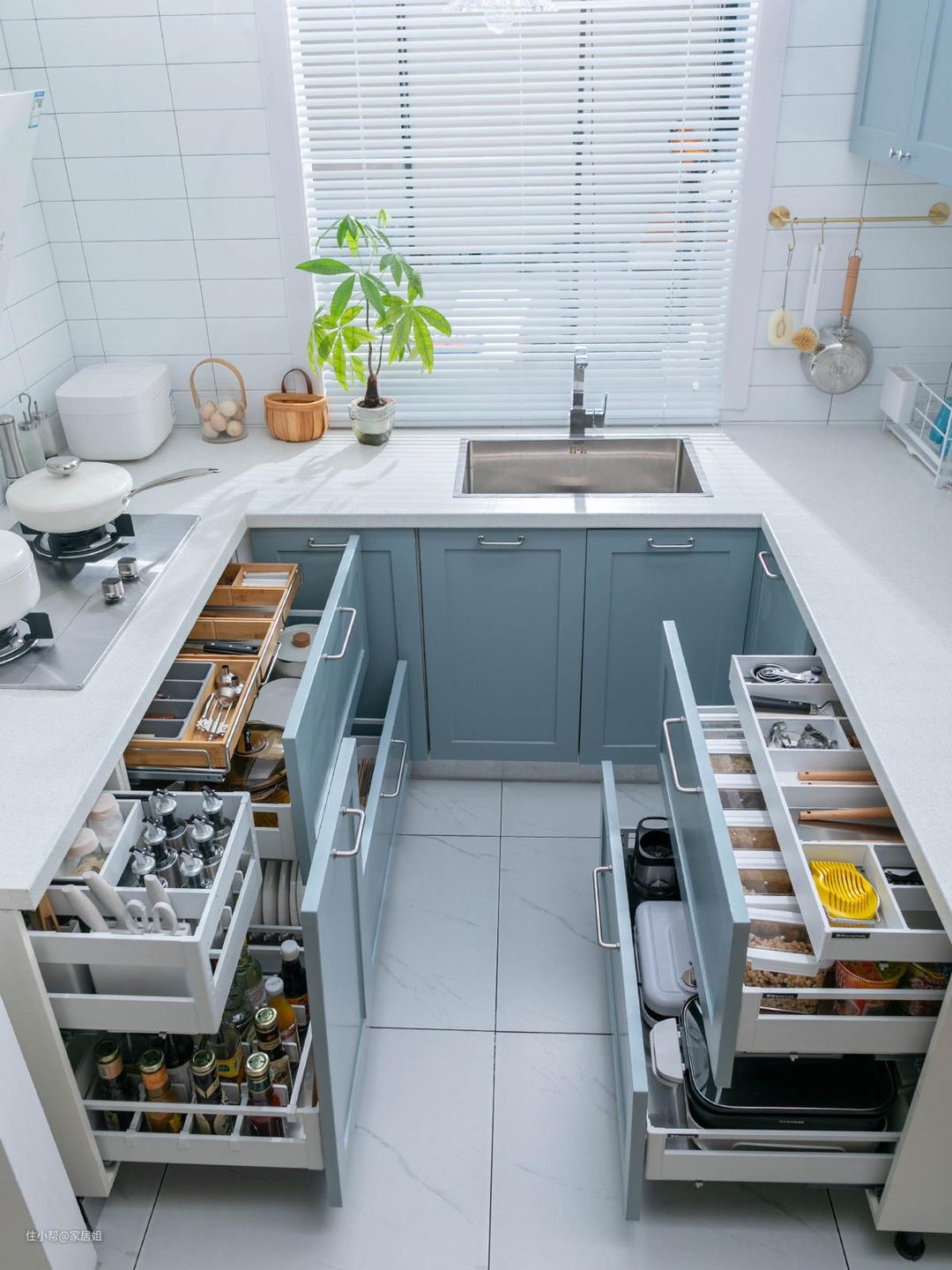厨房不装吊柜的人越来越多了,但是如果有条件,抽屉建议大家一定要设计几个,聪明人都是这样做的。