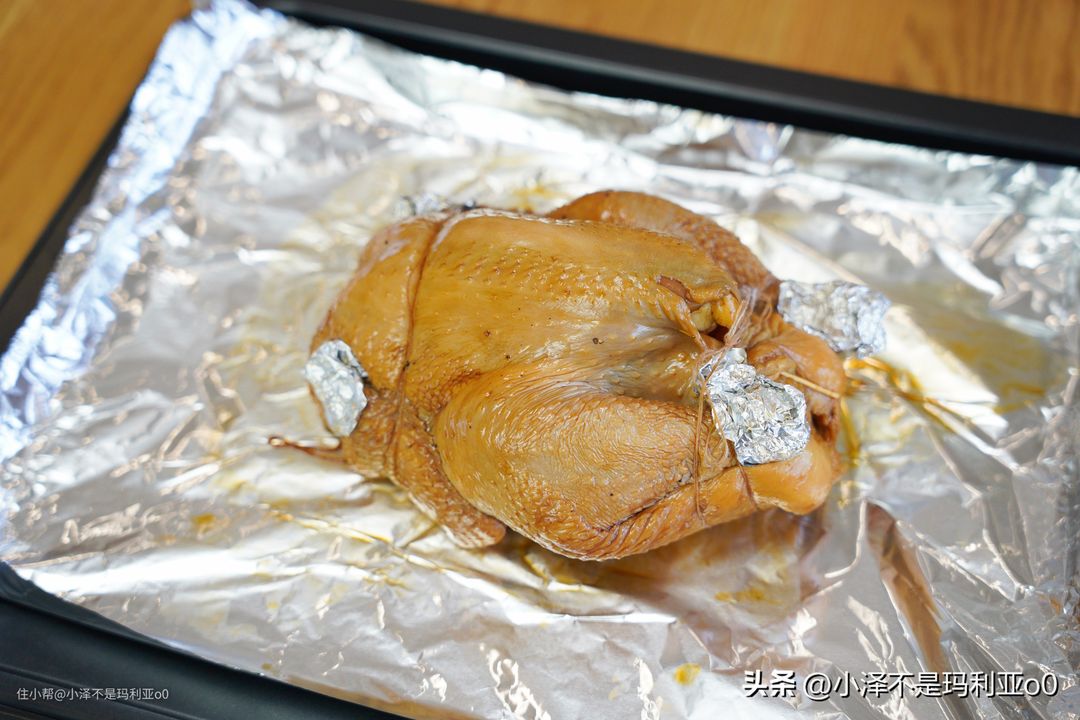 烤鸡的做法也很简单:三黄鸡用老抽,生抽,耗油,蜂蜜、料酒腌制4小时,然后直接送进烤箱开启200℃的双动力烤,烤2小时即可。