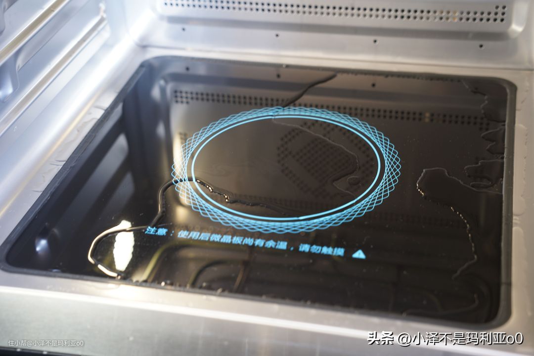 下烤管的另外一个功能是通过加热蒸发底盘上的冷凝水,减少积水残留,这块微晶底盘平时清洁起来也方便,烤完肉滴落的油渍,用毛巾沾上洗洁精一擦就能干净。