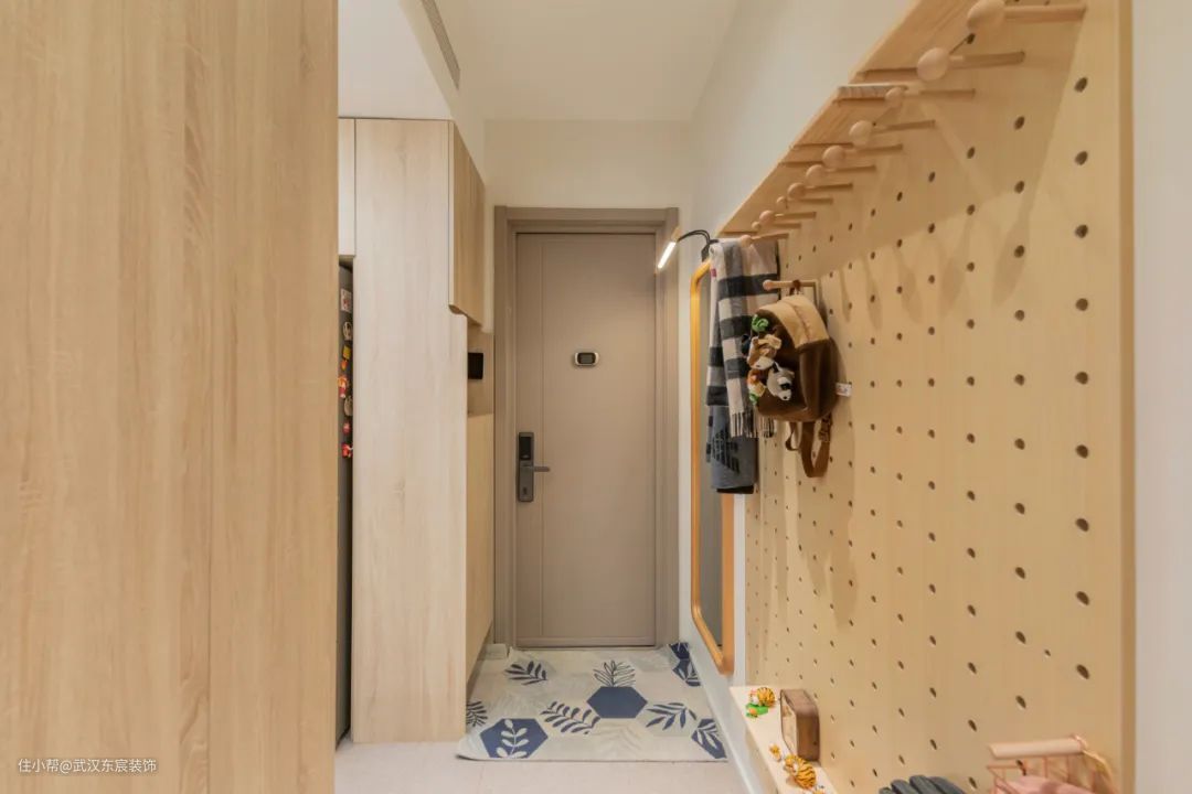 对于玄关来说,洞洞板的友好程度满分,尤其在一些没有玄关的小户型里,也可以利用墙面空间实现玄关收纳,在门边的挂钩或搁板上挂一些随身用的小物件,一眼就能看到,非常实用~