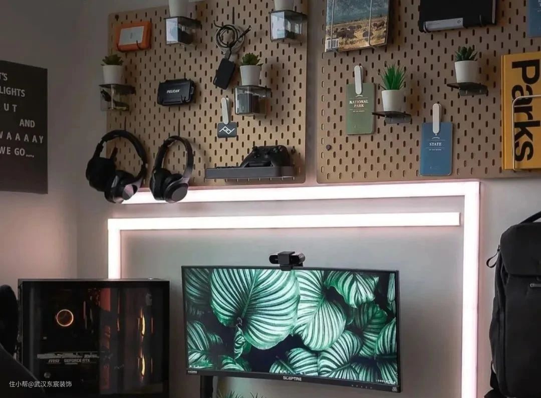洞洞板和书桌绝对是黄金拍档,收纳一些高颜值摆件、小绿植,既可以为繁重的工作和学习增添一丝趣味,又可以随用随放,不会全部散乱在桌面上。