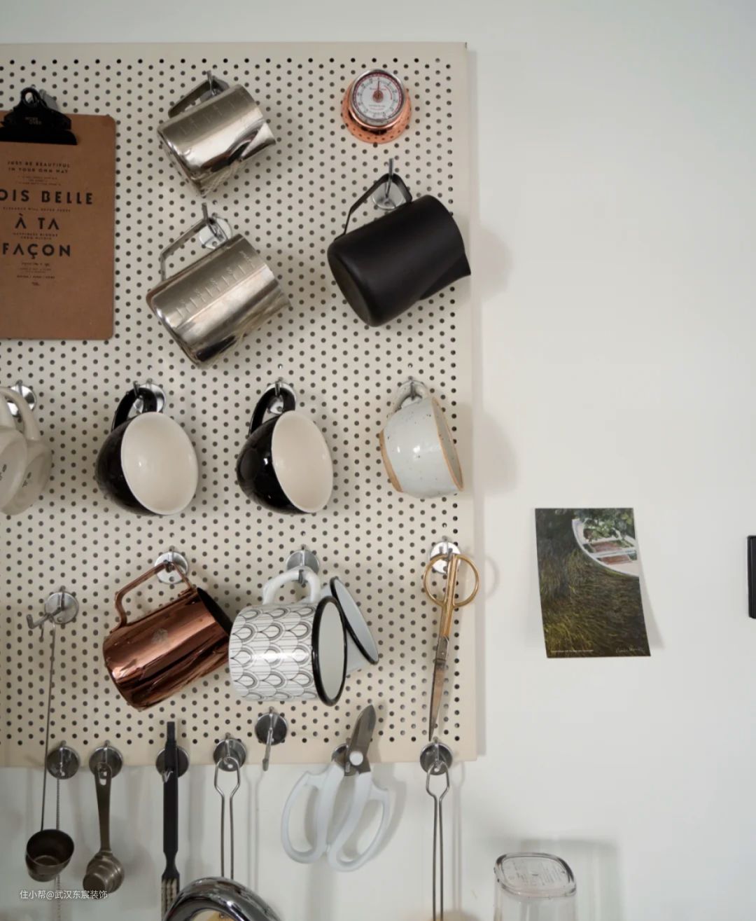 厨房安上洞洞板,可收纳餐厨用具,拿取又方便,还能速干不生霉。需要注意的是,考虑到厨房的油烟问题,洞洞板尽量设计在远离油烟机的地方,可以减少油烟污染。