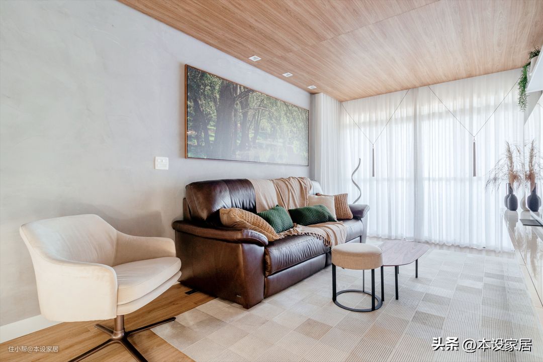 整体布置比较简单,以原木+白为基调,咖啡色的皮革沙发柔软又舒适,搭配草绿色、米白、米黄色抱枕和盖毯,这样设计更加高级。而小巧玲珑的原木色茶几,在满足使用功能的同时,又方便移动,不占地方,避免了笨重大茶几给空间带来的压抑感。