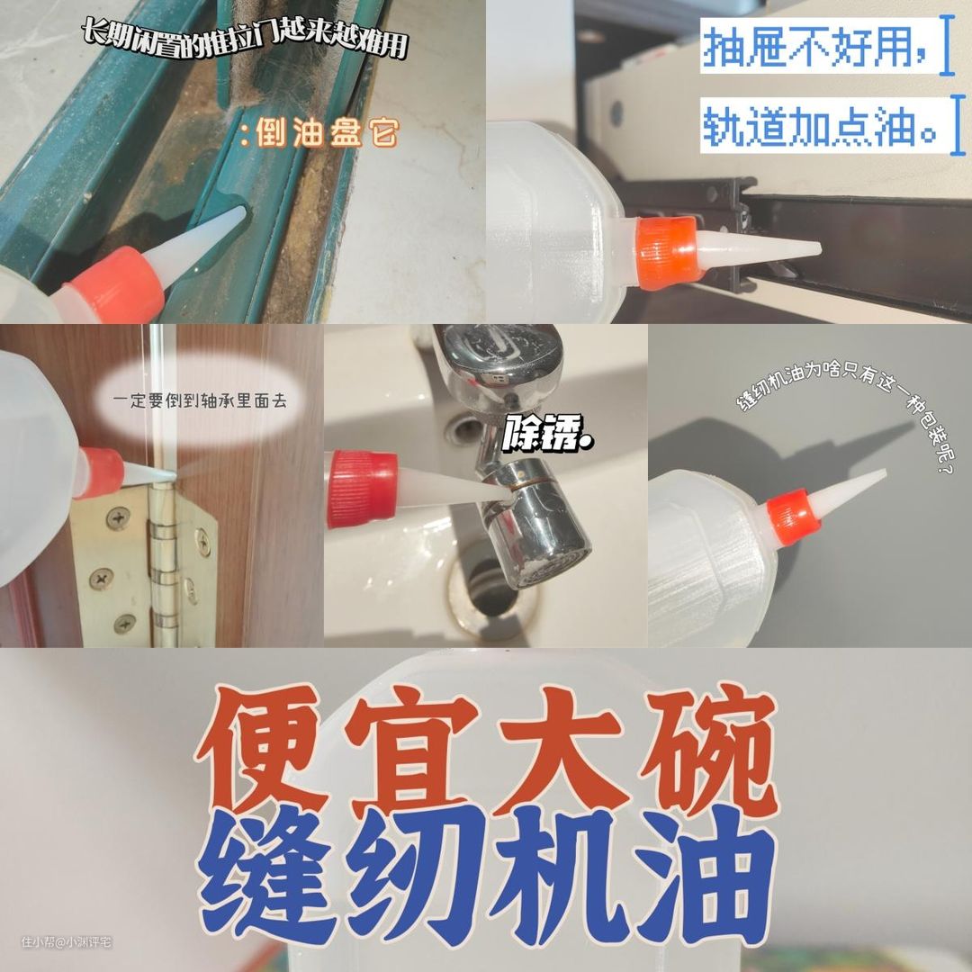 •润滑方面我们也有更好的替代品——缝纫机油!即使缝纫机已经从生活中消失了,但两块钱一瓶的缝纫机油却依然能在任何一个五金店里看到。润滑效果,能秒杀WD-40。