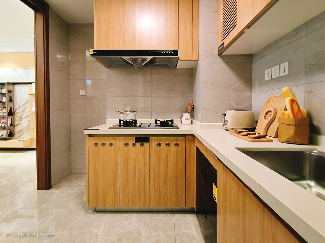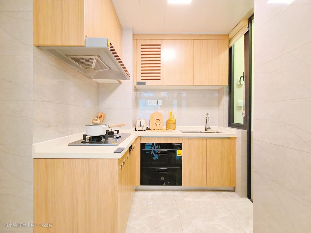 L型的布局,使高菜-切菜-炒菜-装盘的动线来布置,动线方便清晰。吊柜+地柜的设计,让厨房的杂物“有地方可待”让女主人对这个厨房满心欢喜。