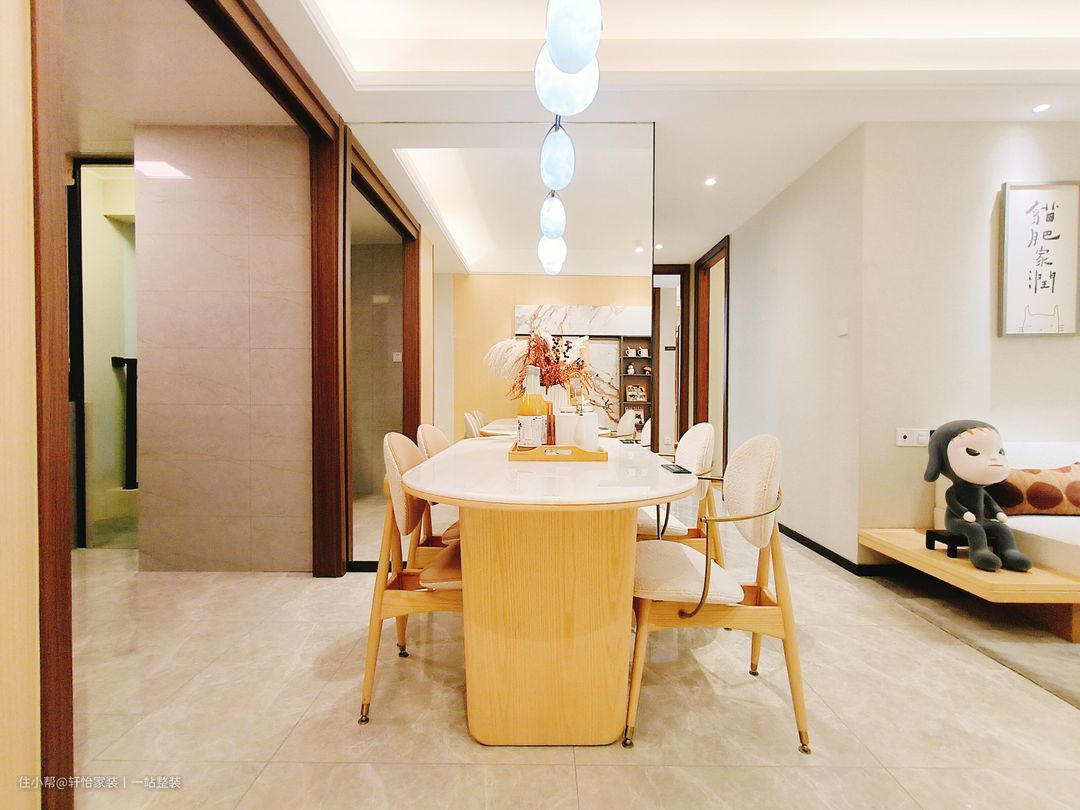 造型独特的布艺原木餐椅配上长餐桌,日式原木的氛围感立刻有了。椭圆形设计感吊灯与餐厅有点格格不入的意思,但是反而打破了整体枯燥乏味的感觉。餐厨之间用巧妙的布置和串联到到一起,形成一个互动性超高的社交型空间,平时邀请亲朋好友到家中小酌一杯,欢声笑语,都能轻松hold住!