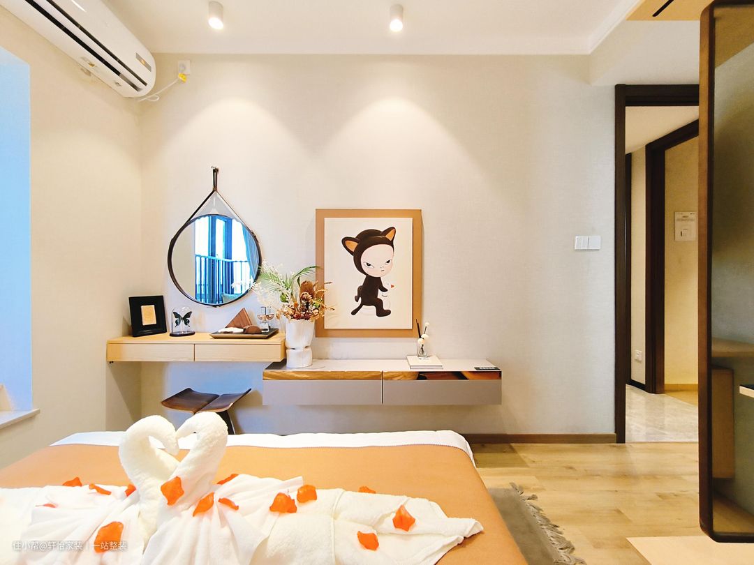 主卧开放式衣柜的设计,满满的高级感,挂衣区+开放格+抽屉收纳,不用的区域有不同的使用方法,不仅满足多种收纳需求,而且易于拿取,一目了然。我们还为女主人专门在床位打造了梳妆台,悬浮的设计简约美观省低台的设计,平时梳妆办公都很方便。