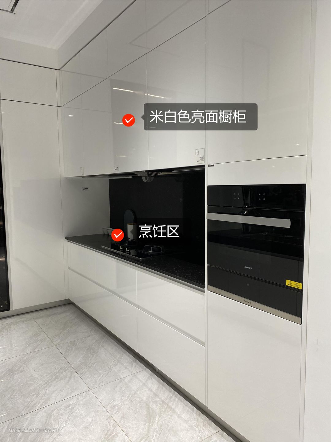 亮面橱柜,不仅使收纳面积增加,还能很轻松去除日常的油烟污渍,使厨房保持一个干净整洁的环境。