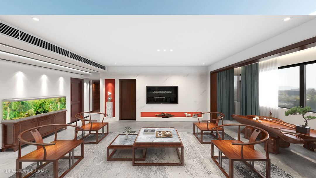 靠墙定制新中式的实木鱼缸,鱼缸造景,把大自然搬进缸里带回家,让家立刻生动起来,营造出属于自己的一片自然天地,在简约舒适的空间下,铺叙出一种端庄高级的中式雅韵感。