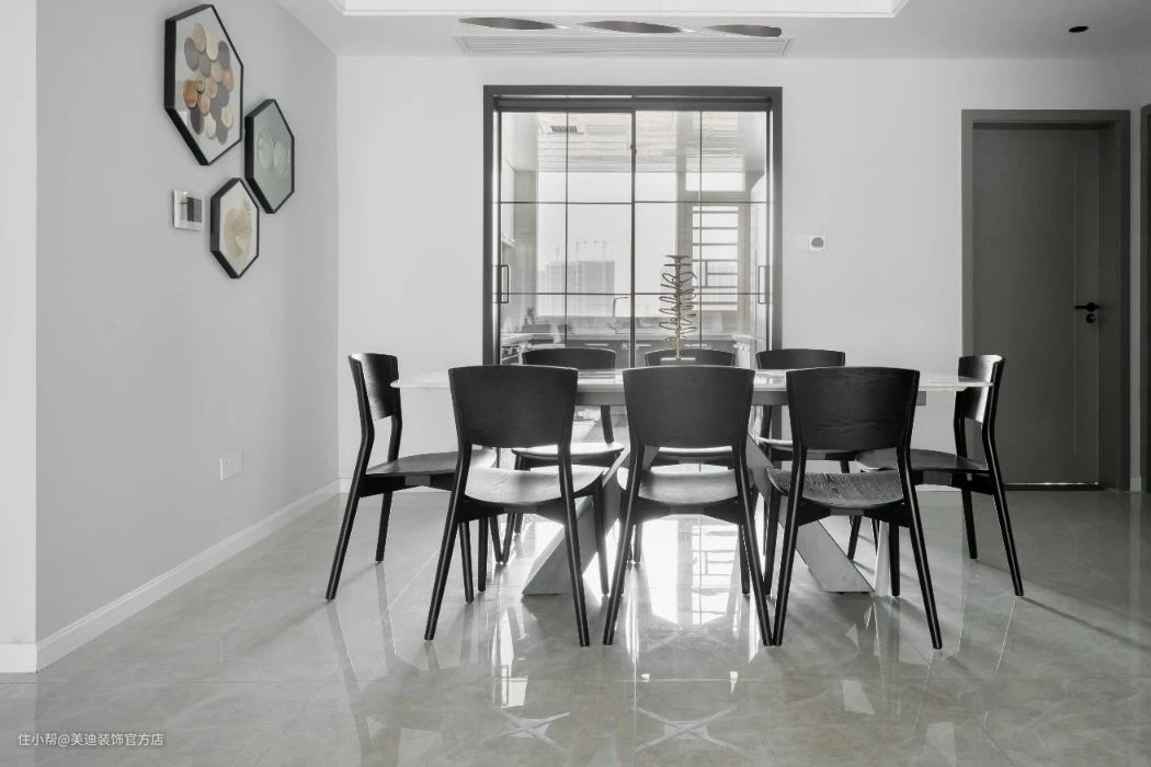 餐厅线条简洁而清晰,灰色圆桌搭配上黑色餐椅,缀以极具艺术气息的装饰品,打造了一个格调满满的都市轻奢空间,就餐仪式感满满。
