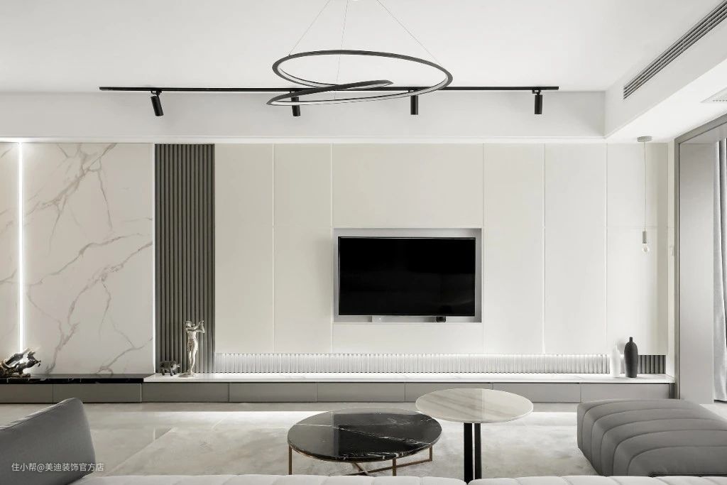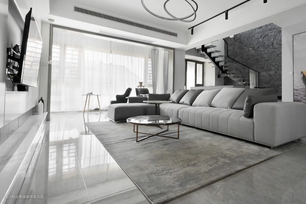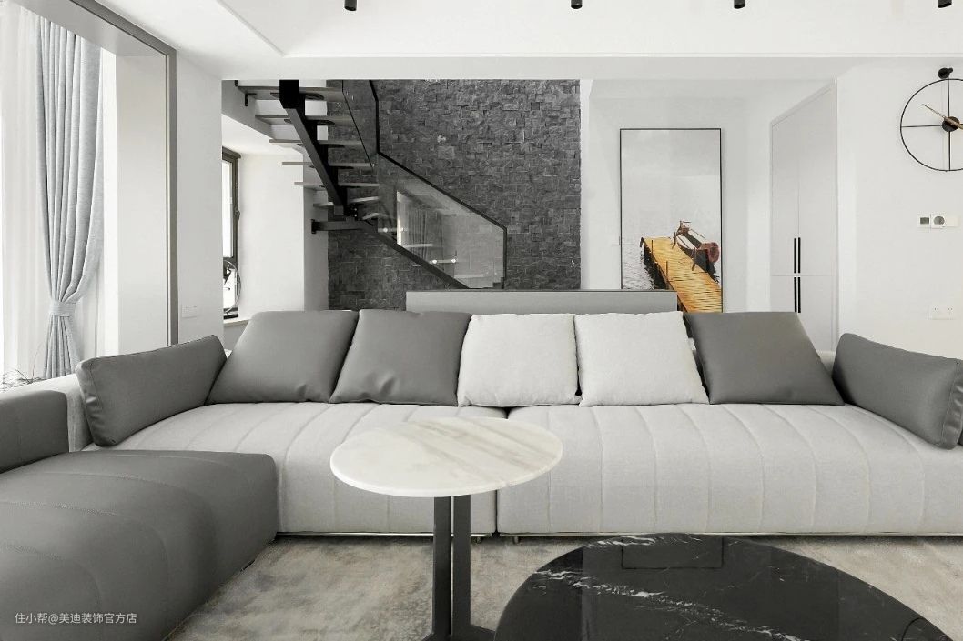 一楼客厅色彩以黑白灰为主,简约干练。电视背景墙采用大理石和木格栅的组合,层次更加丰富。