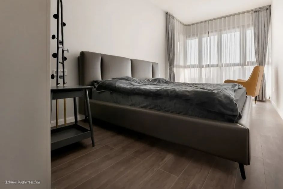 次卧是深色的主色调,灰色搭配原木,自然提升了空间中的暖意,让空间看起来精致且充满质感。