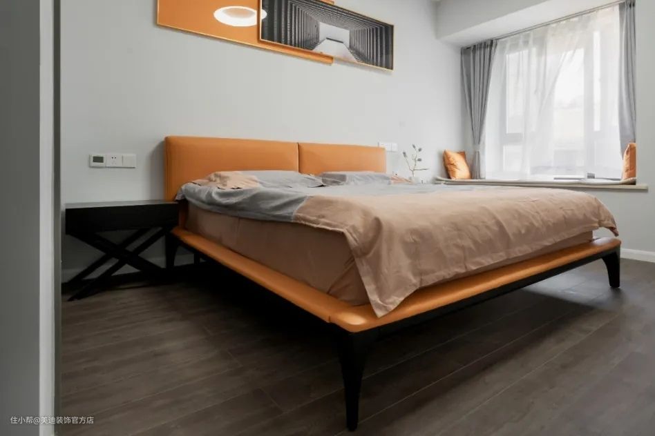 主卧橘黄色的床与橘黄色的抽象画,相互呼应着,跳跃又轻巧,颇具有现代艺术气息。