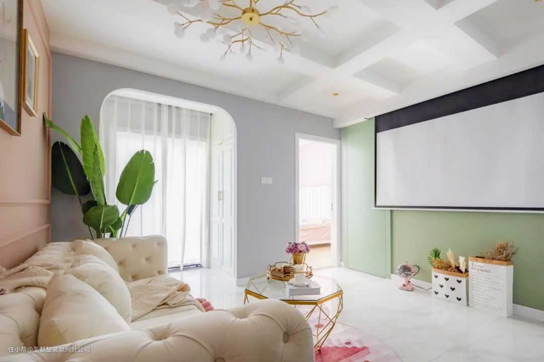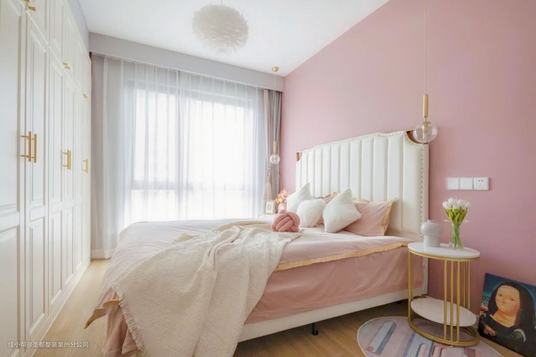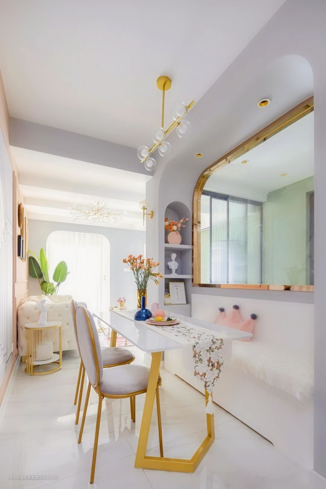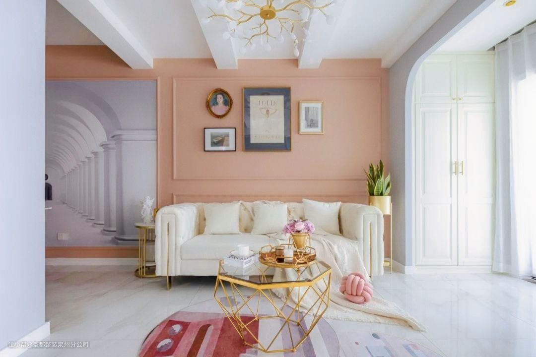 粉色调搭配少女心满满,石膏线条与相框打造复古空间,金属线条在温柔的背景下成为一抹精致优雅的调味剂。