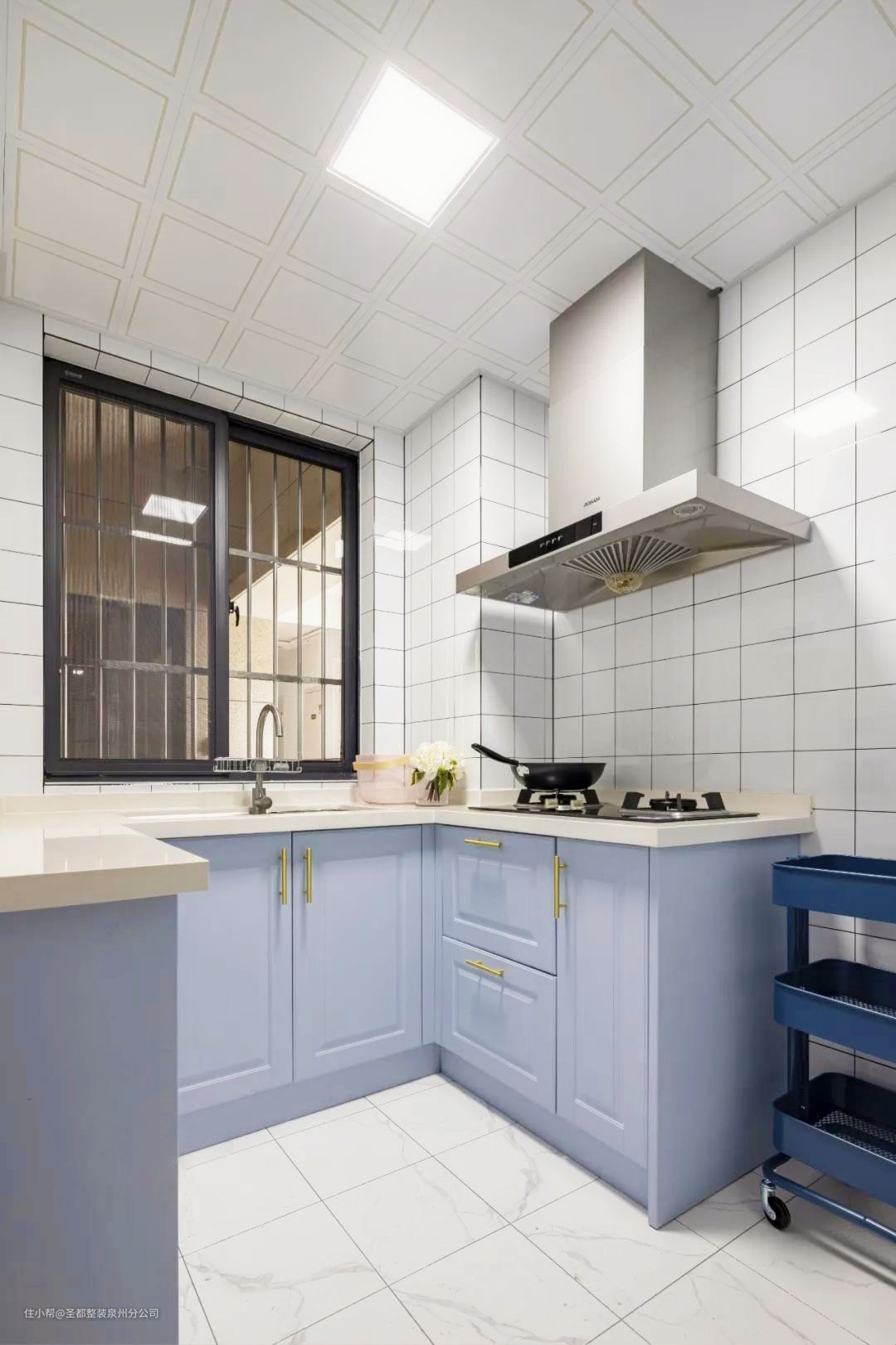 厨房天蓝色主调,搭配清新的小白砖,做菜时刻的愉悦心情都像漫步在蓝天白云之间。