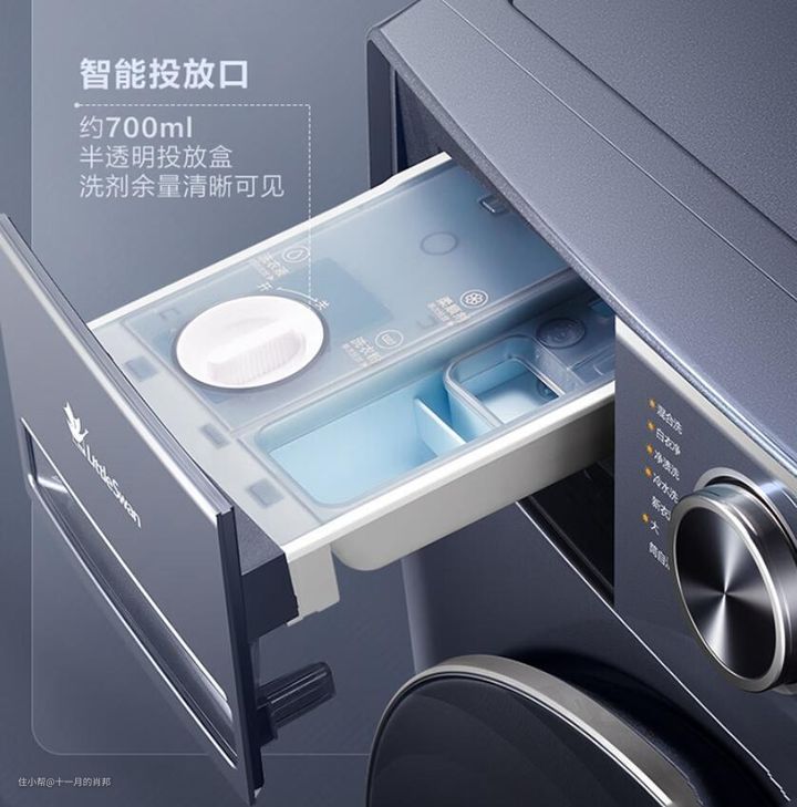 这款小天鹅洗烘还搭载700ml半透明洗衣液投放口,采用I-smart智投放技术,可以自动感知衣重、水量,智控投放量洗衣液,无需每次手动添加,用量恰好,减少漂洗,残留更少,对人体来说更健康!