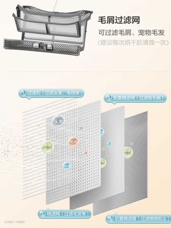 ● 四重过滤 家里养的有猫,每次抱在身上都要掉一身毛,就算用了洗衣机洗干净后也有细小的毛发残留美,而美的的洗烘套MG100V33WY+MH100VH03Y却解决了这个问题。 烘干机的四重精密过滤网可以拦截各种毛线碎屑,避免毛屑残留,每次烘干后衣服表面都是干干净净的,不需要手动拍打,确实省了不少力气。 而且机器内筒也不会有毛屑残留,很好地保护了机子的正常运作,更加经久耐用。