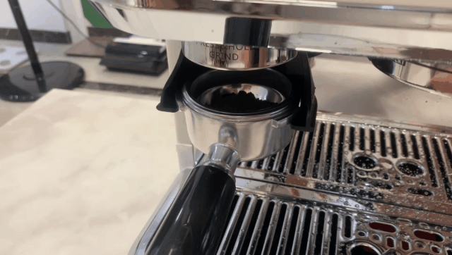 然后将研磨好的咖啡粉放置萃取泵进行检查是否卡入槽口,然后开始萃取咖啡。