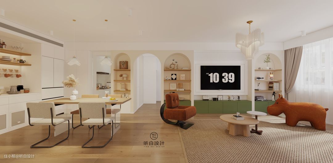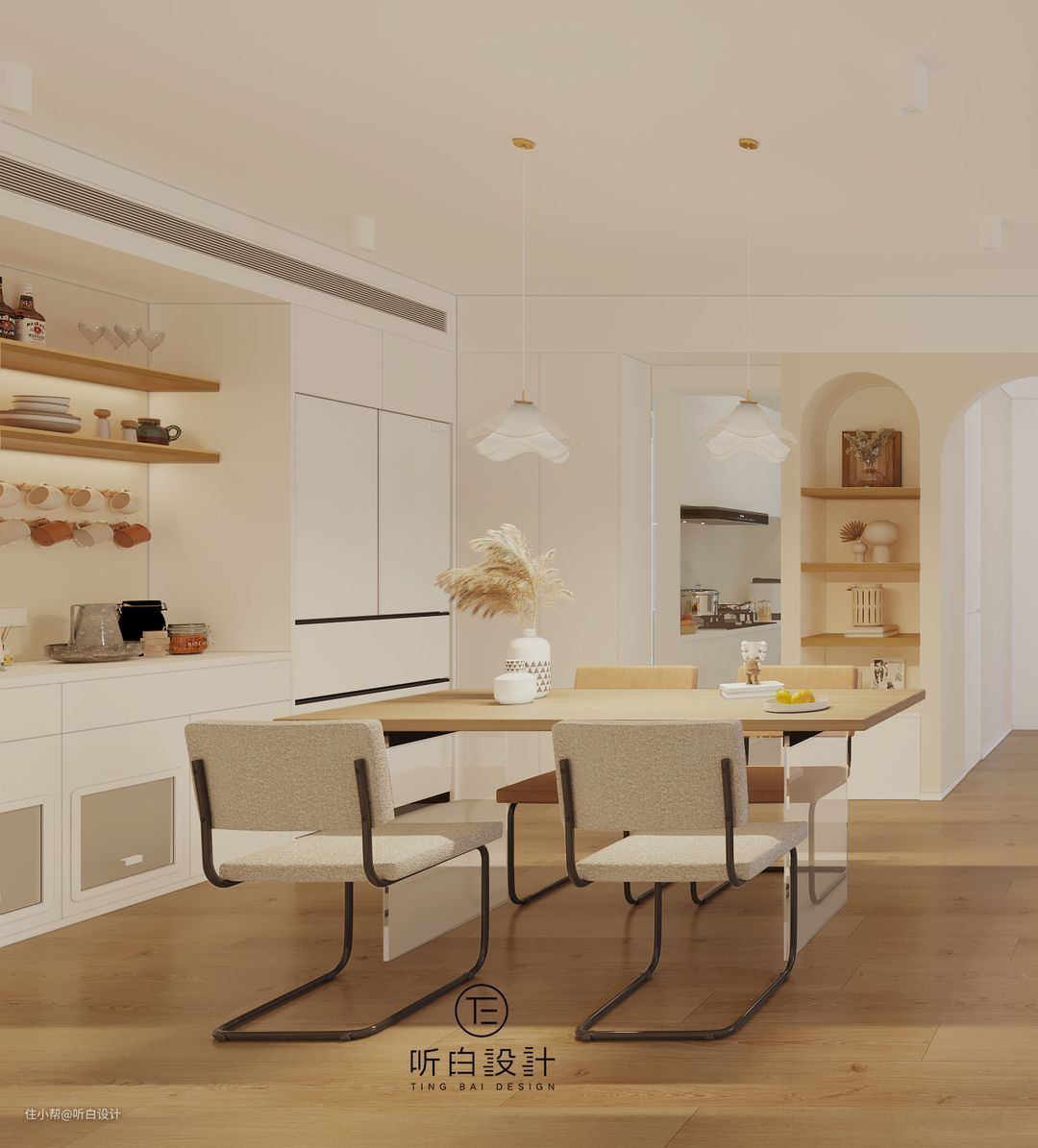 在这种设计中,冰箱做嵌入式设计或放在餐边柜旁提供食材和饮料的冷藏和冷冻功能。而餐边柜则位于冰箱旁,用于存放餐具、碗盘、餐巾等用餐相关物品。通过将冰箱和餐边柜合二为一,不仅节省了空间,还提供了更加便捷的使用体验。