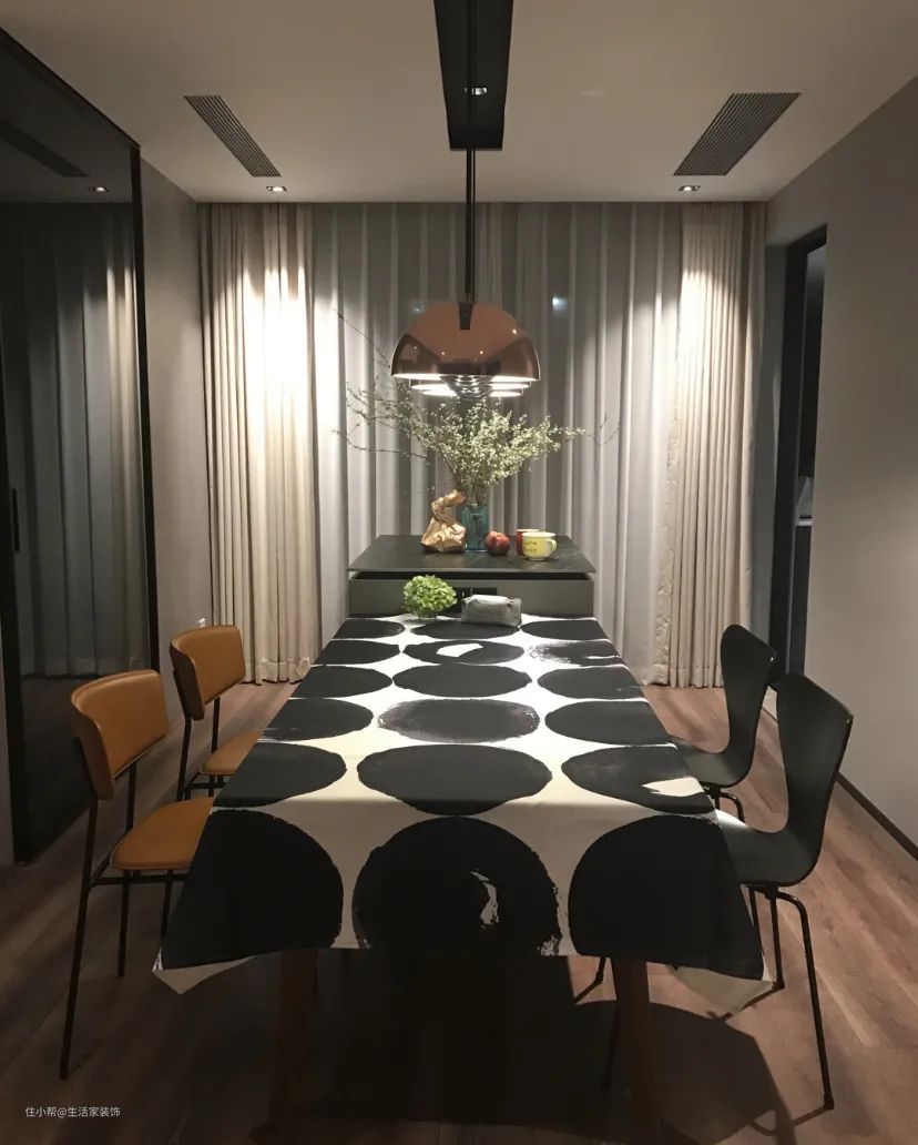 一般来说,餐厅照明推荐使用吊灯,可以营造“聚拢感”,用餐更温馨。其次,吊灯的高度应该距离桌面650mm左右,超过这个距离,易产生眩光;