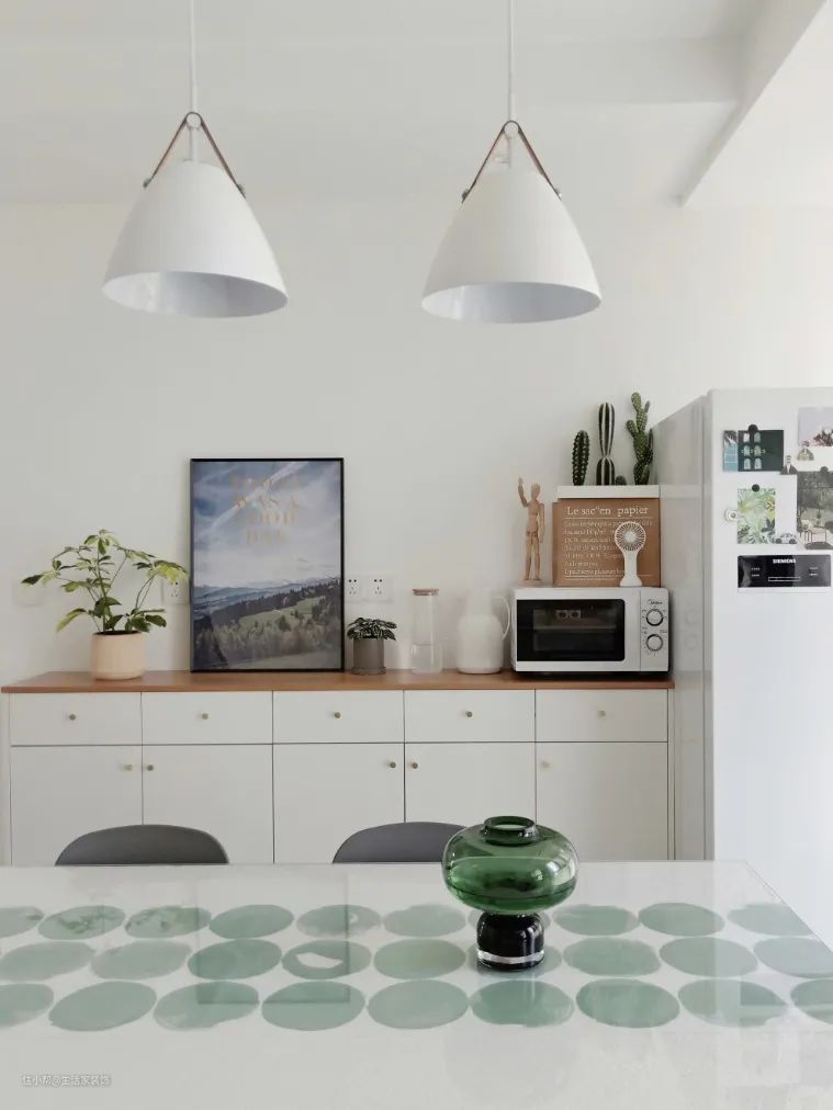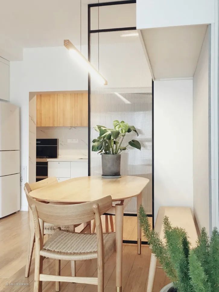 最后,我们可以在餐桌上摆放一些绿植,让餐厅氛围变得清新自然,也可以平衡灯光、玻璃、大理石带来的冰冷感,让空间充满生机。