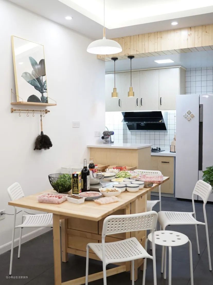 ·合适的餐桌:首选长方桌,简约百搭,适合一般的三口之家或者多口之家使用;折叠桌节省空间,也能增加收纳空间;圆桌能承载一大家族人的用餐需求,围坐在一起的氛围也让彼此更加亲昵。
