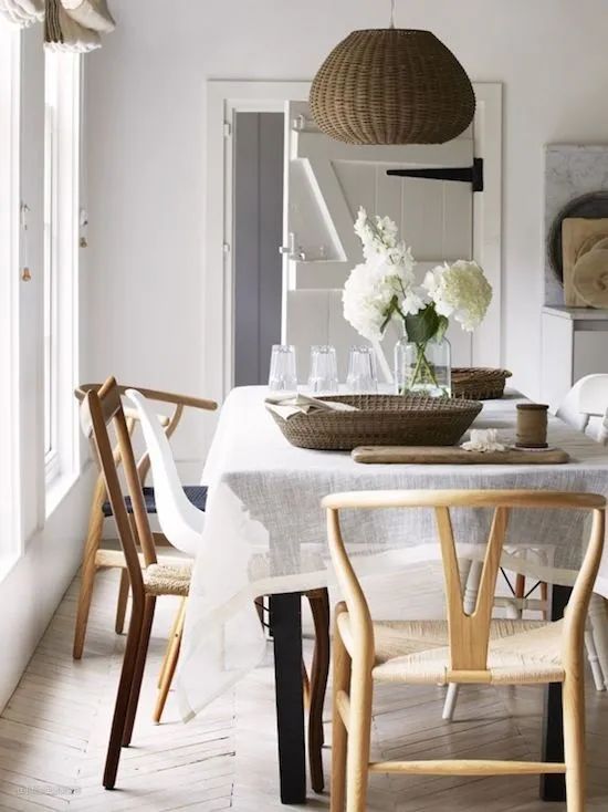 对于餐厅色调是浅色系的,比如原木风格,选择灰色与白色的桌布比较合适。白色显得整洁干净,如果桌子上有精美的摆设比如烛台之类,选白色能很好地衬托。而灰色比较耐脏,也显得沉稳,与白色一样是一劳永逸的选择。