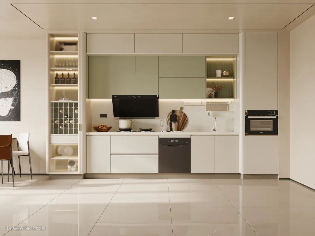 整体厨房的空间颜色最多不超过三种,色调过多易显得杂乱。