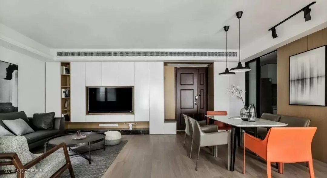 在功能受到空间影响的情况下,选择一体化设计的设计应该是最好的选择,比如将玄关柜与餐边柜结合,又或者采用玄关柜与电视柜一体化的组合,甚至,可以玄关柜+餐边柜+电视柜一体设计。