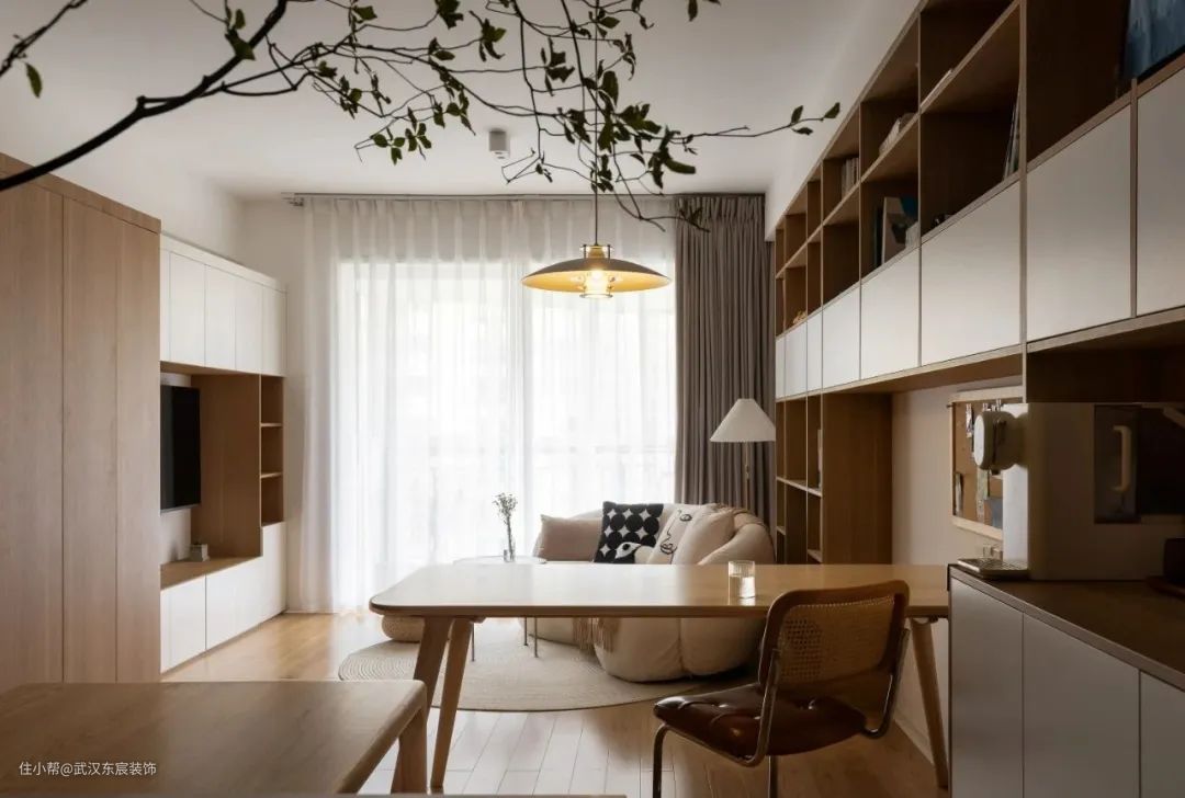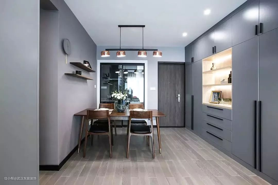 定制柜从入户一直做到餐厅、客厅,利用一整面墙打造收纳,可以一次满足玄关、餐厅、客厅三个区域的收纳需求。