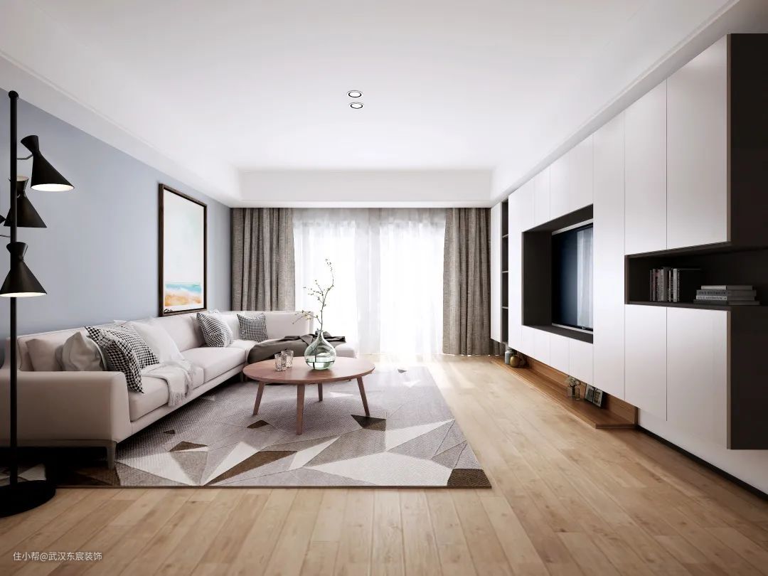 入户与客厅之间没有墙体,呈长条形分布,同样可以做相连的一字形玄关柜+电视柜,收纳力超强,实现了一个家庭收纳的“半壁江山”。
