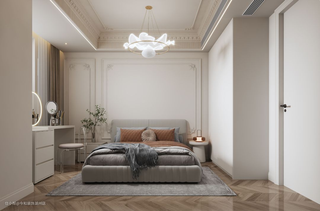 4、次卧 灰色床单与墙面杏色碰撞融合,打造出层次丰富的艺术气息。以现代手法为框架,融入法式线条装饰,将浪漫尽情到底。