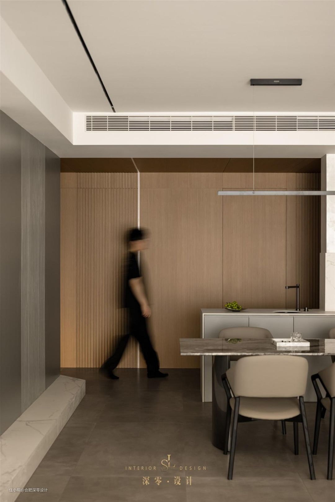 为了避免大面积木饰面造成的单调,局部做了格栅,同时对墙面所在的室内门做了隐形处理,长过道最大的问题就是采光,内嵌灯带即可,简洁的线条感和温馨的灯光,无疑成为增加室内氛围感的一大利器。