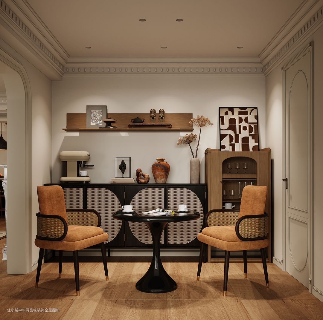 大量的木质元素让餐厅充满自然质朴气息,弥漫着温暖惬意的烟火气息,餐边柜拱形门设计自带复古韵味。